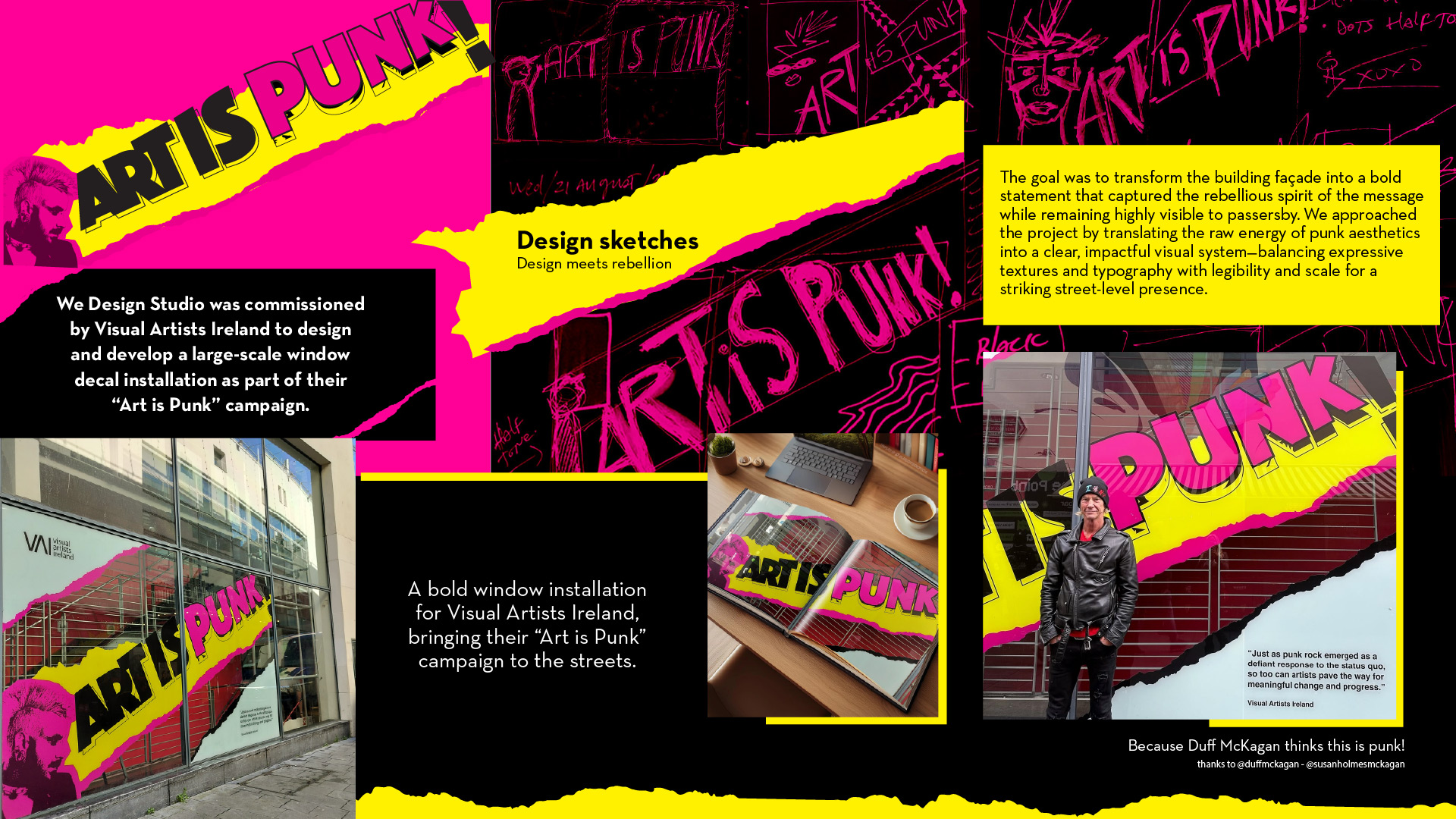 A bold window installation for Visual Artists Dublin, bringing their “Art is Punk” campaign to the streets.